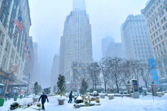 हिमपातले ढाकियो न्युयोर्क, सेताम्य शहरमा रमाउँदै युवायुवती (फोटो)