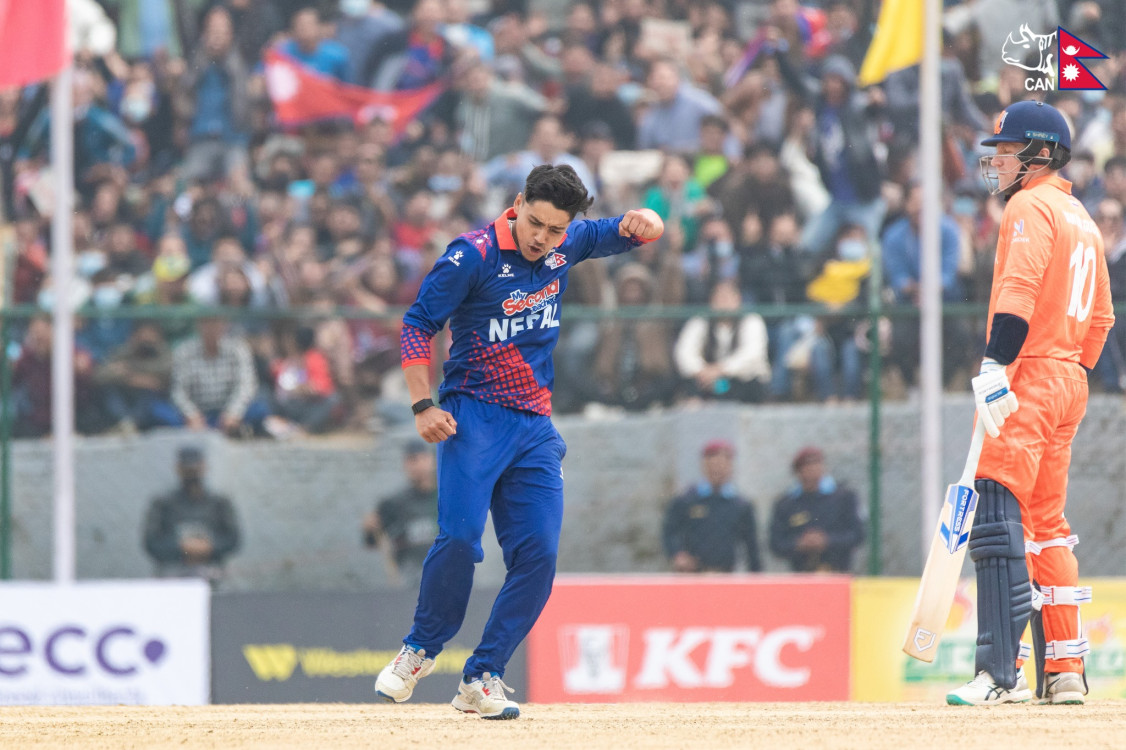 १४औं ओभरको तेस्रो बलमा उनले व्यक्तिगत तेस्राे विकेट लिएसँगै नेपालले सातौं सफलता हात पारेको छ।तेस्रो विकेट लिने क्रममा उनले तेजा निडामानिरुलाई आउट गरे।,