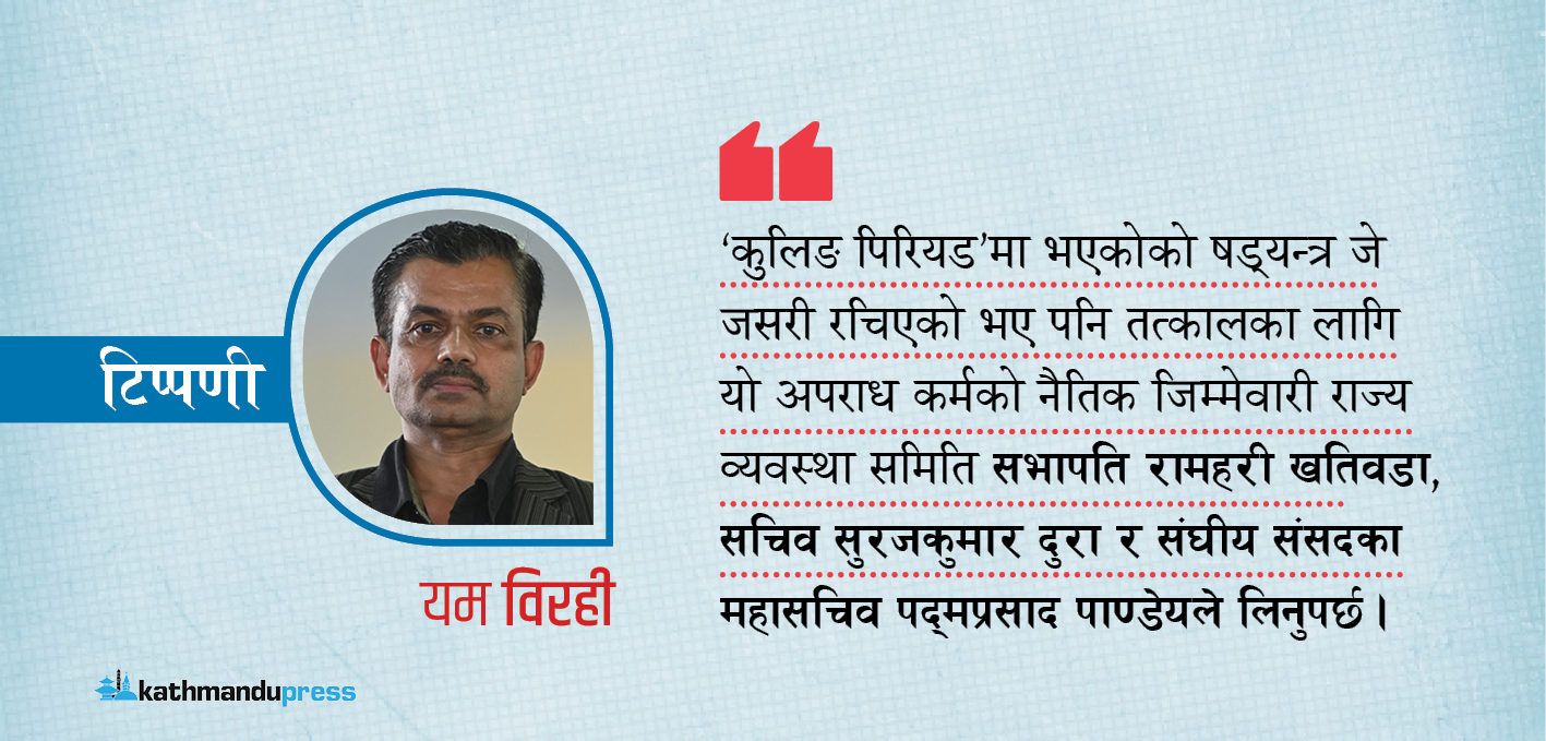 कुनै उपाय नचलेपछि ‘किर्ते’को हतियार प्रयोग भएको देखिन्छ। षड्यन्त्र जे जसरी रचिएको भए पनि तत्कालका लागि यो अपराध कर्मको मुख्य रुपमा नैतिक जिम्मेवारी राज्य व्यवस्था समितिका सभापति रामहरी खतिवडा, सचिव सुरजकुमार दुरा र संघीय संसदका महासचिव पद्म प्रसाद पाण्डेयले लिनुपर्छ। छानविन समिति बनेर प्रतिवेदनको निष्कर्ष नआउञ्जेलसम्मका लागि पदबाट अलग हुनुपर्छ। छानविनबाट दोषी देखिए जो–जसको यस प्रकारणमा गठजोड देखिन्छ, तत्काल हदैसम्मको कारबाही हुनुपर्दछ। कुनै पनि बहानामा उम्कन छुट छैन। र, कुलिङ पिरियडको व्यवस्था संसदमा गरिएको बाचा अनुसार पुरानै अवस्थामा लैजानुपर्दछ।