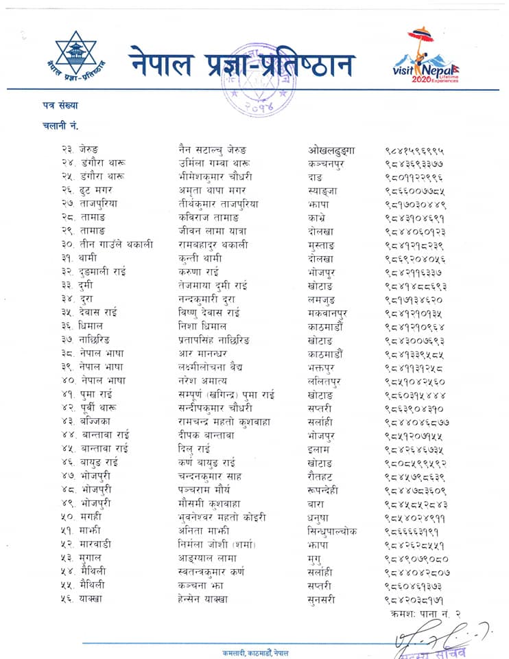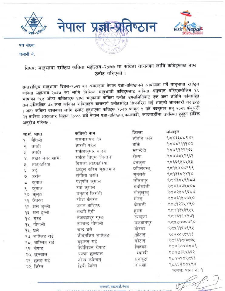 काठमाडौं, फागुन ४ : नेपाल प्रज्ञा प्रतिष्ठानले मातृभाषा राष्ट्रिय कविता महोत्सव २०७७ मा कविता वाचनका लागि कविहरुको नाम छनोट गरेको छ । प्रतिष्ठानले ५६ भाषाका १५४ कवितामध्ये ७० कविता छनोट गरेको छ ।
