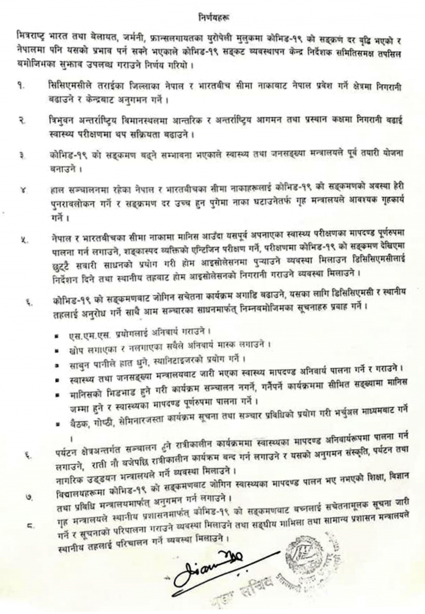 त्यस्तै, त्रिभुवन अन्तर्राष्ट्रिय विमानस्थलमा आन्तरिक र अन्तर्राष्ट्रिय आगमन तथा प्रस्थान कक्षमा निगरानी बढाइ स्वास्थ्य परीक्षणमा थप सक्रियता बढाउनुपर्ने, स्वास्थ्य तथा जनसंख्या मन्त्रालयले पूर्वतयारी योजना बनाउन र हाल सञ्चालनमा रहेका सीमानाकालाई कोभिड–१९ को संक्रमणको अवस्था हेरी पुनरावलोकन गर्नुपर्ने जनाएको छ।