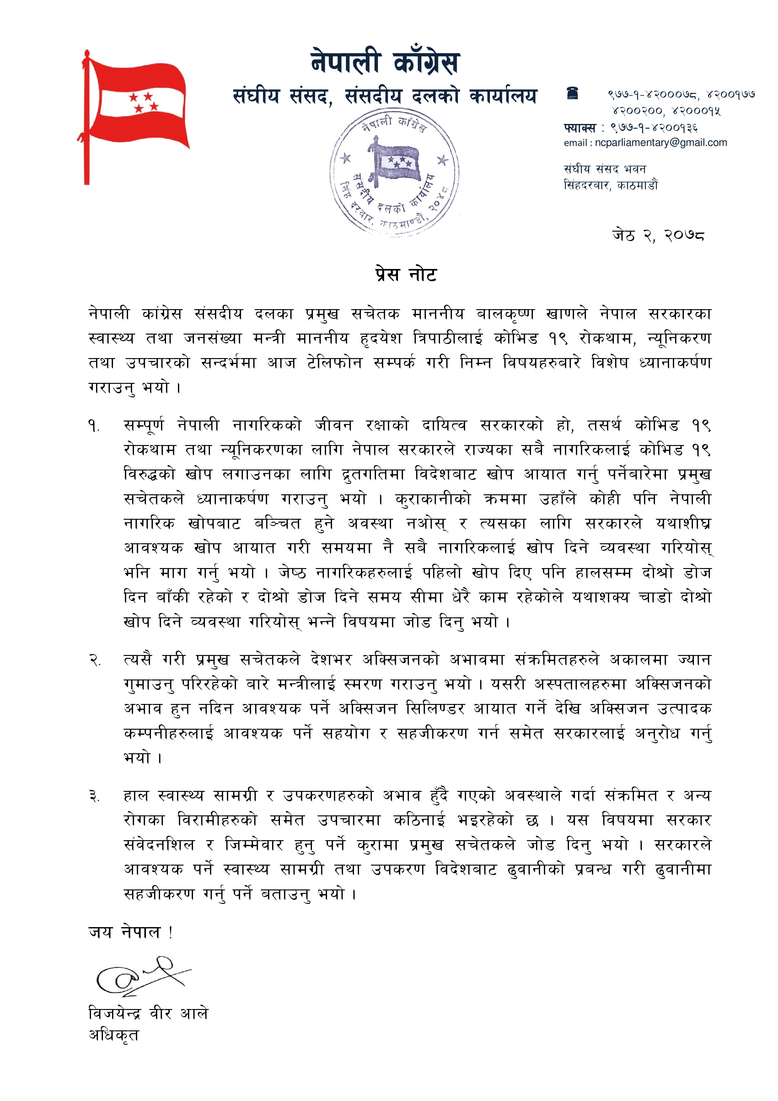 खाणले आज मन्त्री त्रिपाठीलाई टेलिफोन मार्फत कोभिड १९ विरुद्धको खोप प्रकारी नभएको देशभर अक्सिजनको अभाव भएको लगायतका बिषयमा ध्यानाकर्षण गराएको दलका अधिकृत विजयेन्द्र वीर आलेले एक प्रेस नोट मार्फत जानकारी गराएका हुन् ।