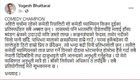 उनले अगाडि लेखेका छन्, ‘त्यसैले कमेडी च्याम्पियनको ताज प्राप्त गर्ने यिनको दौडमा भोटमार्फत होस्टेमा हैंसे गर्दा सबै नेपाली दिदिबहिनी तथा दाजुभाइले पनि आनन्दको अनुभूति गर्नुहुनेछ। यो मेरो व्यक्तिगत अनुभूति मात्रै हो । बाँकी निर्णयको अधिकार त तपार्इंकै। सबै प्रतियोगीलाई मेरो शुभकामना छ।’