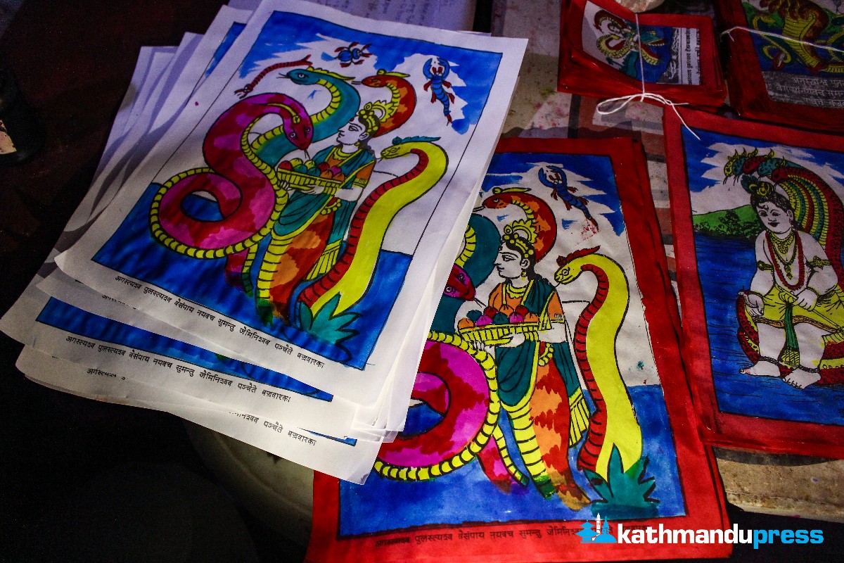 छापेको कागजमा उनले वाटर कलर लगाउँछन्। घाम र पानी पर्नासाथ कागज र रंग दुवै जाने गरेको उनी बताउँछन्। भन्छन्, ‘नागको चित्र सानो तथा ठूलो आकारमा बनाइएको छ, जसको मूल्य १० रुपैयाँदेखि ४० रुपैयाँसम्म पर्छ। बजारमा भारतबाट आएको पोस्टर पाँचदेखि १० रुपैयाँमा पाइन्छ।’