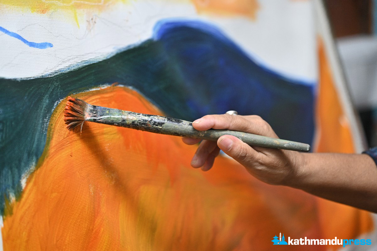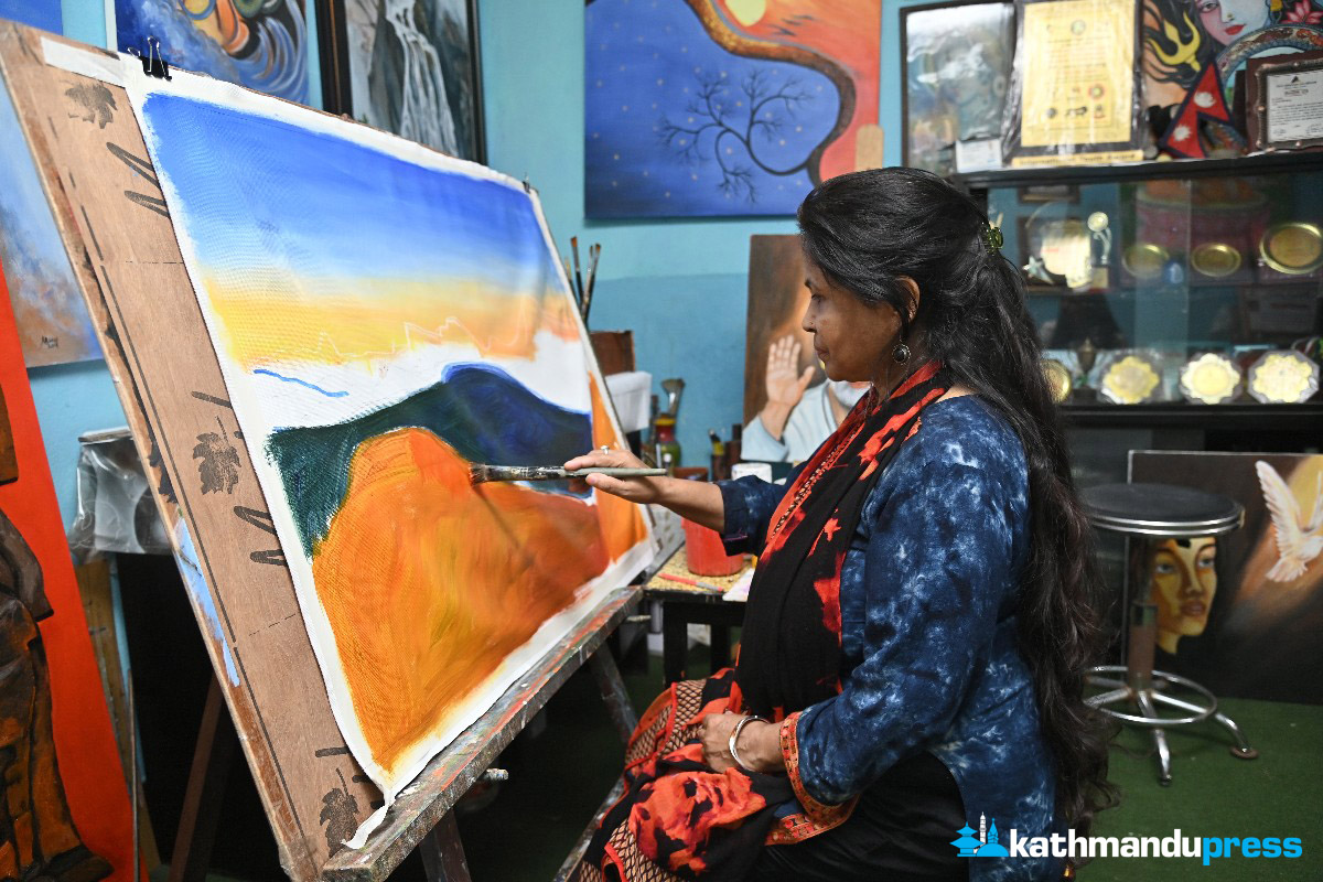 काठमाडाैं, साउन ३२ : अघिल्लो मंगलबार बिहान चित्रकार अरुणा हिङमाङ नयाँ बानेश्वरस्थित आफ्नो स्टुडियोमा भोजपुरको सुन्तले डाँडालाई क्यानभासमा उतार्दै थिइन्। क्यानभासमा विशेषतः पाँच रङ पोतिएका थिए– नीलो, सेतो, गाढा हरियो, पहेँलो र सुन्तला। ‘यो घाम अस्ताउने बेलाको सुन्तले डाँडा हो,’ अरुणा भन्छिन्, ‘त्यसैले पहेँलो र सुन्तला रङको पनि प्रयोग गरेकी छु।’