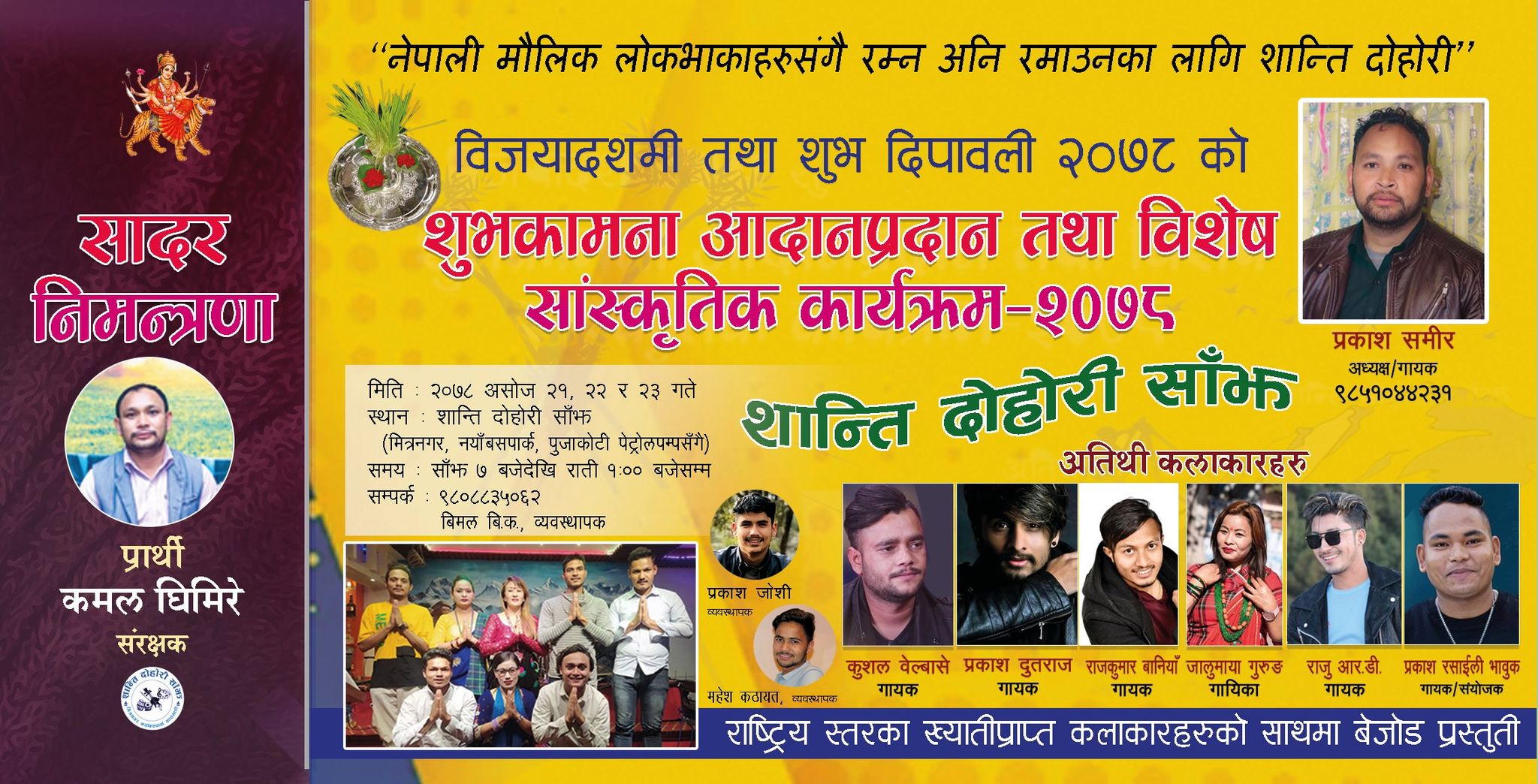 काठमाडौं, असोज २३ : पत्रकार तथा गायक प्रकाश समीरले दोहोरी साँझ सञ्चालनमा ल्याएका छन्।