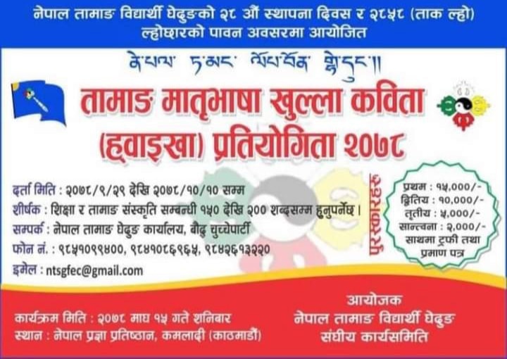 प्रतियोगिता आगामी माघ १५ गते दिन कमलादीस्थित नेपाल प्रज्ञा प्रतिष्ठान कमलादीमा हुने आयोजकले जनाएको छ। ‘शिक्षा र तामाङ संस्कृति’ शीर्षकमा आधारित भई कविताको सिर्जना गर्नुपर्नेछ। कविता १५० देखि २०० शब्दसम्मको हुनुपर्नेछ।