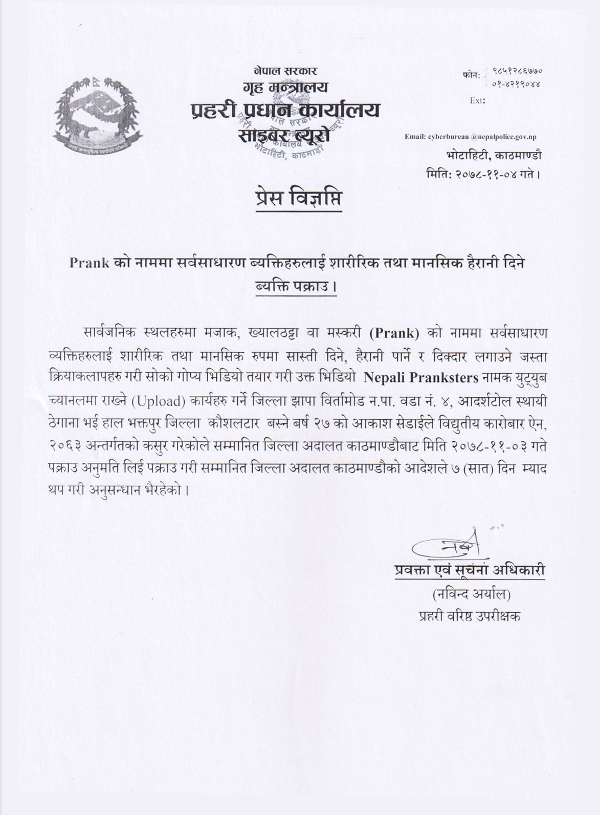 प्रांकका नाममा सर्वसाधारणलाई शारीरिक तथा मानसिक हैरानी दिएको भन्दै उक्त युट्युब च्यानलमा भिडियो अपलोड गर्ने २७ वर्षका सेडाईंलाई मंगलबार प्रहरीले हिरासतमा लिएको हो।