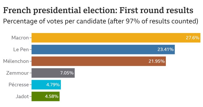 म्याक्रोनसँग हाल २७.४१ प्रतिशत मत छ भने अति दक्षिणपन्थी राष्ट्रपति पदका उम्मेदवार मारिन ले पेन २४.०३ प्रतिशतका साथ दोस्रो स्थानमा छिन्।