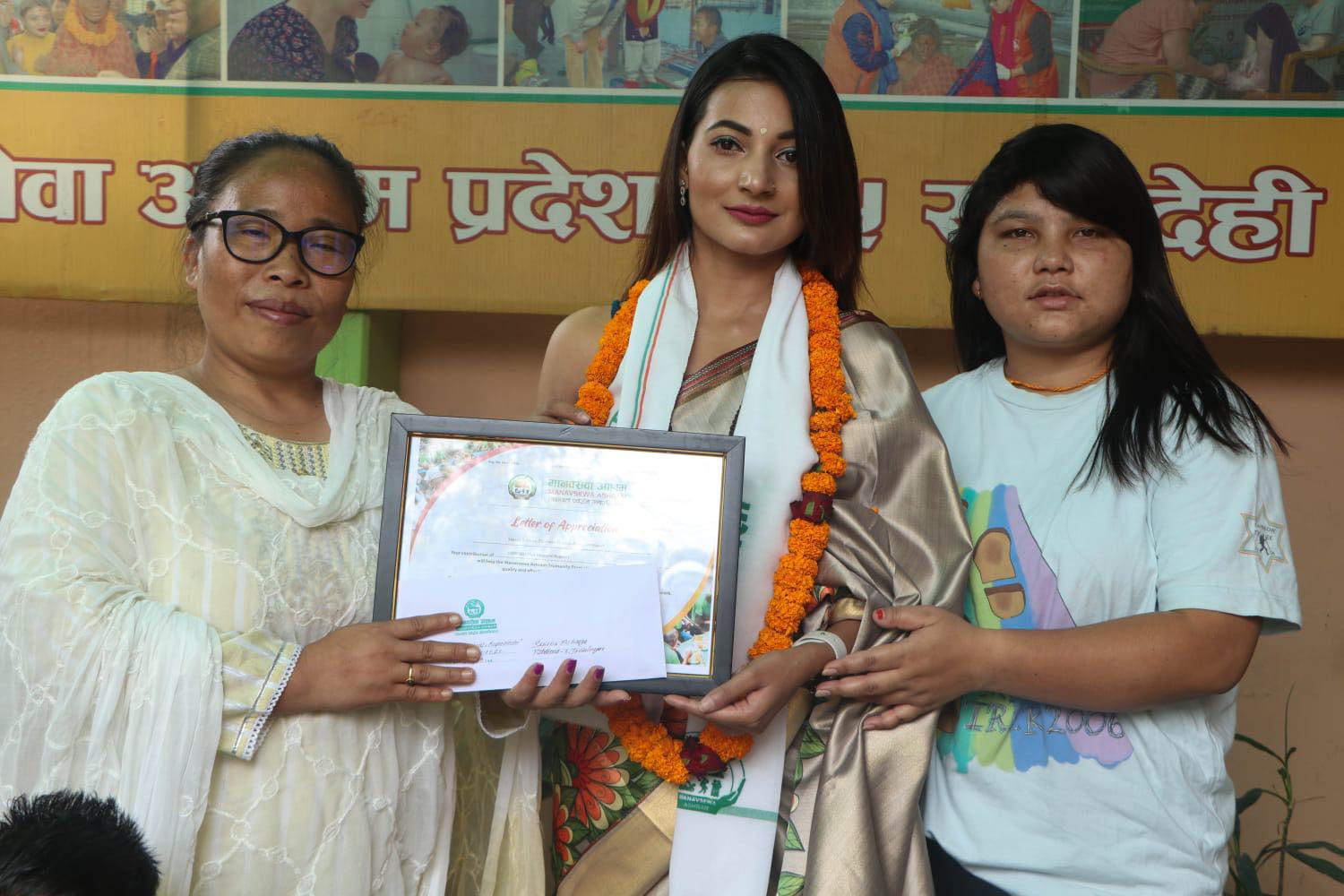 सो अवसरमा मानव सेवा आश्रम बुटवलकी प्रबन्धक सरु अधिकारीले उनलाई खादा र प्रमाणपत्र दिएर सम्मान गरेकी थिइन्।