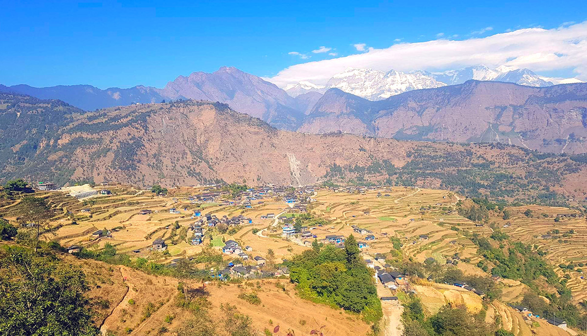 थाक्रामा राखिएको मकै र पृष्ठभूमिमा धौलागिरि हिमाल