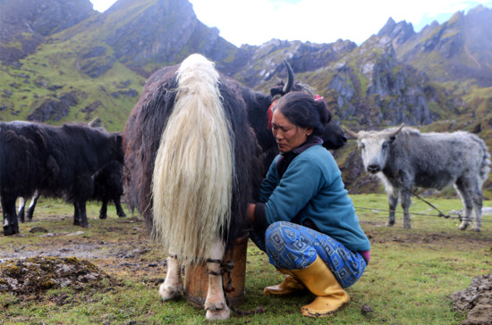 ताप्लेजुङको मिक्वाखोलामा याकको दुध दुहुँदै महिला