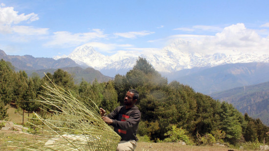 म्याग्दीको रुइसेमा डोको बुन्दै स्थानीय, पृष्ठभूमिमा अन्नपूर्ण हिमाल