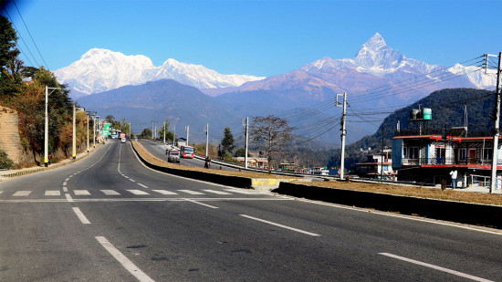 मध्यपहाडी राजमार्गअन्तर्गतको पोखरा सडक खण्ड र त्यहाँबाट देखिने हिमश्रृंखला