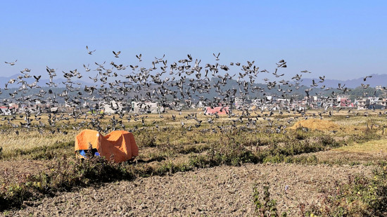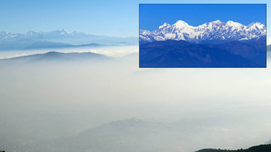 माथि लाङटाङ हिमालको दृश्य र तल हुस्सुले ढाकिएको उपत्यका