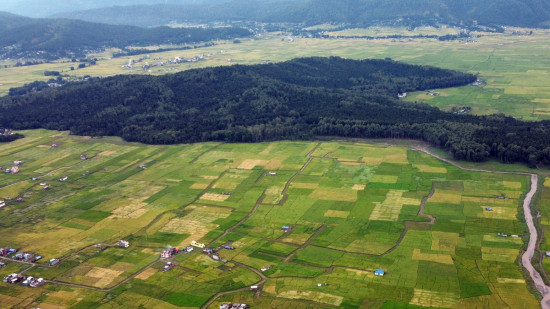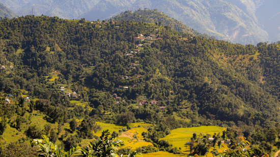 पर्वतको बिहादीमा ठाडा लस्कर घरहरू र धानका बाला झुलेर पहेंलपुर बनेकाे बेंसी