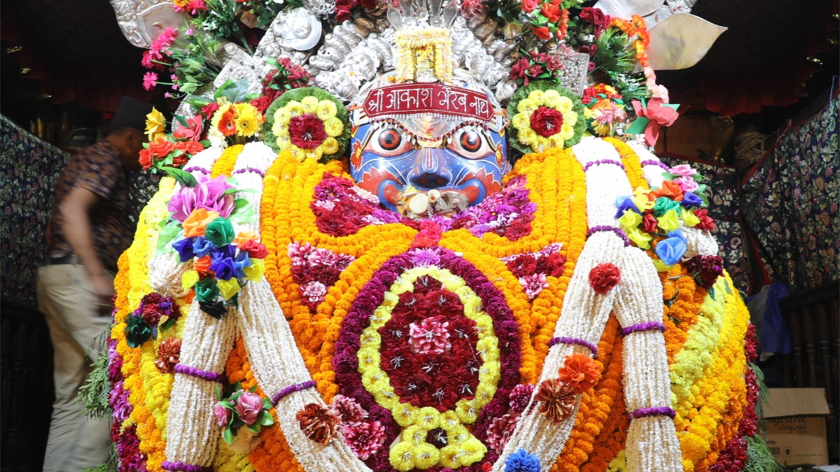 फूलमालाले सिँगारिएकाे आकाश भैरव