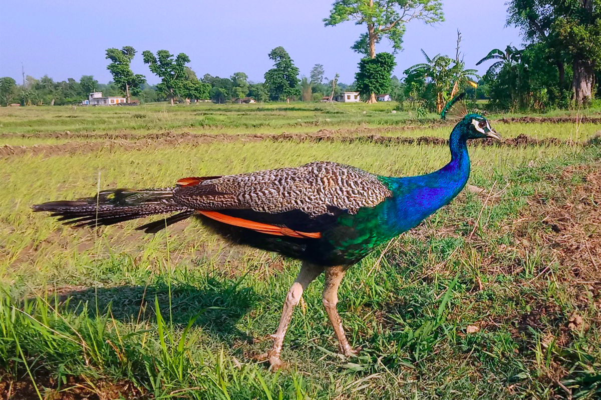 शुक्लाफाँटानजिकै खेतमा चर्दै मयूर