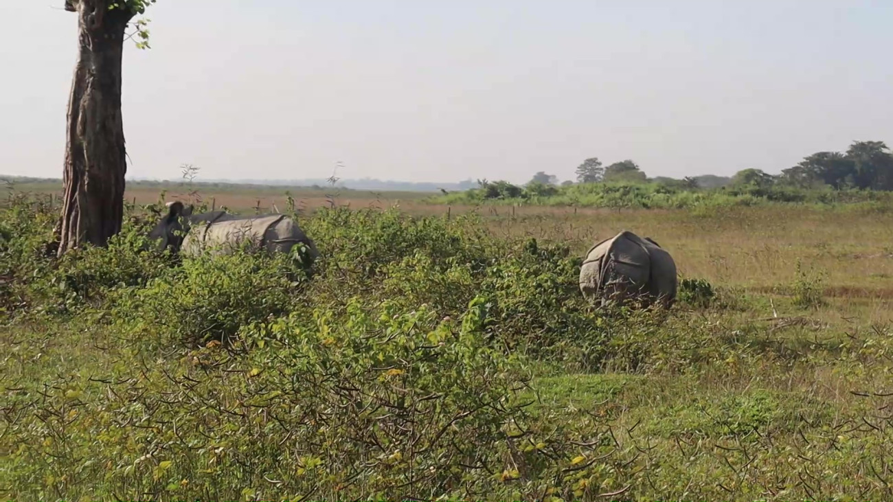 कोशी टप्पुमा सारिएका पोथी गैंडा पुष्पा र अञ्जली कर्मचारीसँग रमाउँदै