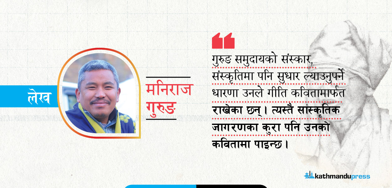 गुरुङ समुदायको संस्कार, संस्कृतिमा पनि सुधार ल्याउनुपर्ने धारणा उनले गीति कवितामार्फत आफ्नो धारणा राखेका छन्। त्यस्तै सांस्कृतिक जागरणका कुरा पनि उनको कवितामा पाइन्छ।