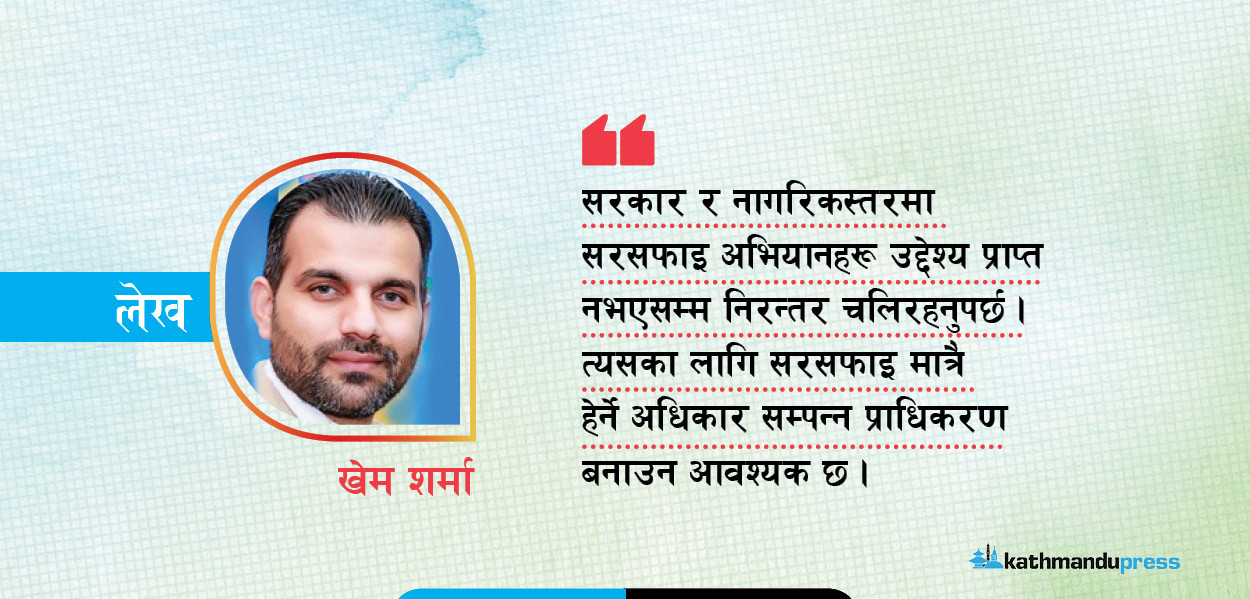 सफा नेपाल सम्भव बनाउनका लागि हामी नेपालीमा रहेको बेवास्ता, लापर्वाही तथा समस्याकैबीचमा सम्झौता गरेर बाँच्ने स्वभाव भने परिवर्तन गर्नैपर्छ । यो परिवर्तन सरकारमा बस्नेदेखि प्रतिपक्ष...