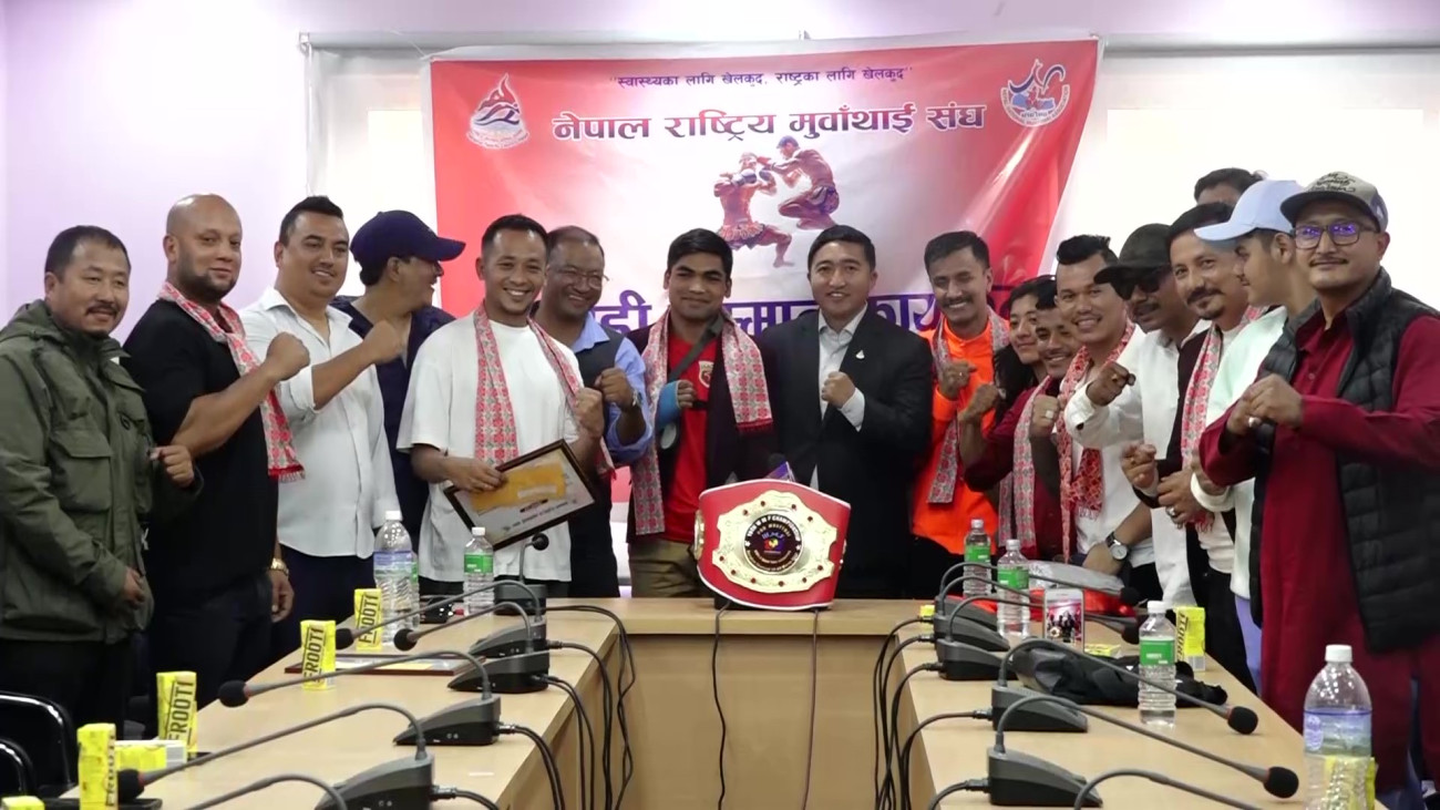 मुवाँथाईं विश्व च्याम्पियनसिपका पदक विजेता खेलाडी तथा प्रशिक्षकलाई सम्मानसंघले शुक्रबार काठमाडौंमा आयोजना गरेको कार्यक्रममा राखेपका सदस्य सचिव टंकलाल घिसिङले थाइल्यान्डको बैंककमा भएको १९औं मुवाँथाईं विश्व च्याम्पियनसिपका पदक विजेता खेलाडी तथा प्रशिक्षकलाई नगदसहित सम्मान...